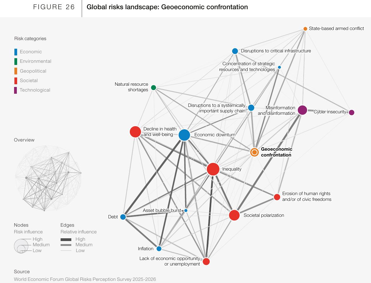 „Da globale Risiken in Bezug auf Umfang, Vernetzung und Geschwindigkeit weiter zunehmen, markiert das Jahr 2026 den Beginn eines Zeitalters des Wettbewerbs. Mit dem Zusammenbruch kooperativer Mechanismen und dem Rückzug der Regierungen aus multilateralen Rahmenwerken ist die Stabilität bedroht. Es entsteht eine umkämpfte multipolare Landschaft, in der Konfrontation an die Stelle von Zusammenarbeit tritt und Vertrauen – die Währung der Zusammenarbeit – an Wert verliert.“