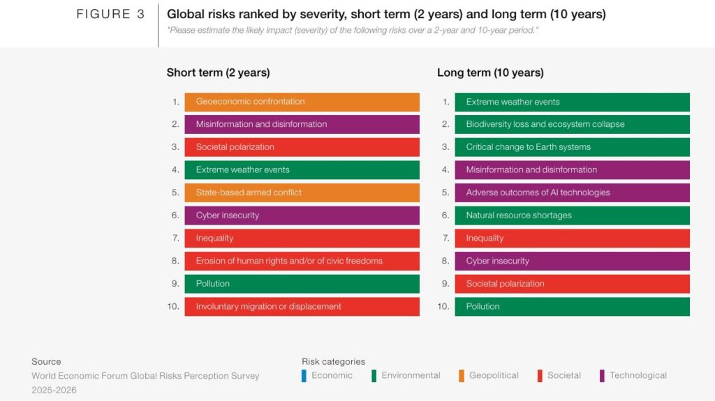 [1] Quelle: https://www.weforum.org/stories/2026/01/global-risks-over-the-past-5-years-what-s-changed-and-what-hasn-t/ bzw. als PDF zum Download: https://reports.weforum.org/docs/WEF_Global_Risks_Report_2026.pdf [2] Zu den Global Risk Reports siehe früheren Beitrag des Autors anlässlich des WEF 2019:https://weltnetz.tv/story/1749-atomkriegsgefahr-kein-thema-auf-dem-weltwirtschaftsforum-davos/
