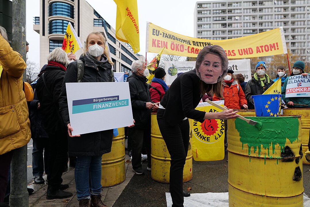 Foto: Kundgebung in Berlin am 18.11.2021 vor dem Willy-Brandt-Haus mit der Forderung an Olaf Scholz sich dafür ein zu setzen, dass Atomkraft und Erdgas nicht als Nachhaltig in die EU-Taxonomie aufgenommen werden. Quelle: Leonhard Lenz / Wikipedia