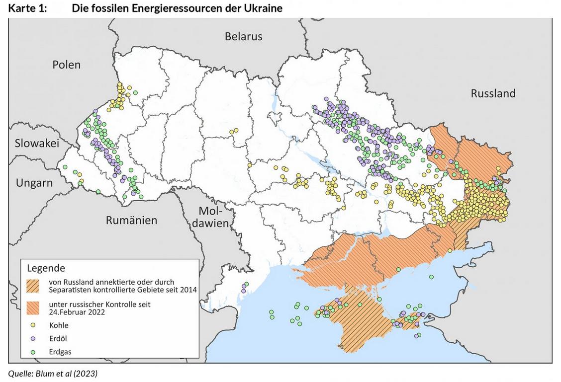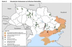 […]Auch die Ukraine besitzt bedeutende, aber weitgehend unerschlossene Vorkommen an Seltenen Erden wie z.B. Neodym und Scandium, sowie an kritischen Rohstoffen wie Titan, Lithium und Graphit, in einem Wert von geschätzt bis zu 11½ Billionen Dollar. Deshalb schlossen die USA im Jahr 2025 Abkommen, welche ihnen den Zugang zu diesen Rohstoffen sichern. Mancher Kommentator sprach damals von der Plünderung der Ukraine (16). Aufgrund des hohen Vorkommens, insbesondere im Osten, sind diese Ressourcen zentraler Bestandteil geopolitischer Interessen. Die Hauptvorkommen liegen allerdings im Südosten des Landes und im Donbass: Etwa 40 % der bekannten Vorkommen liegen in russisch besetzten Gebieten. Solange der Krieg andauert, ist an einen Beginn der Förderung nicht zu denken. Erst dann kann die Infrastruktur für die Förderung erstellt werden. Immerhin dürfte Washington davon ausgehen, dass der Widerstand von Umweltschützern in der Ukraine dank willfährigen und auch korrupten Regierungen schnell überwunden werden kann. Die Ukraine könnte somit eine Schlüsselrolle bei der Diversifizierung der Rohstoffversorgung für westliche Hightech-Industrien spielen. Aber auch hier wird es viele Jahre dauern, bis die begehrten Erze aus dem Boden gegraben werden können (17). […] [Nachfolgende Karten aus: https://www.bpb.de/themen/europa/ukraine-analysen/546618/analyse-die-rohstoffe-der-ukraine-und-ihre-strategische-bedeutung/ ]